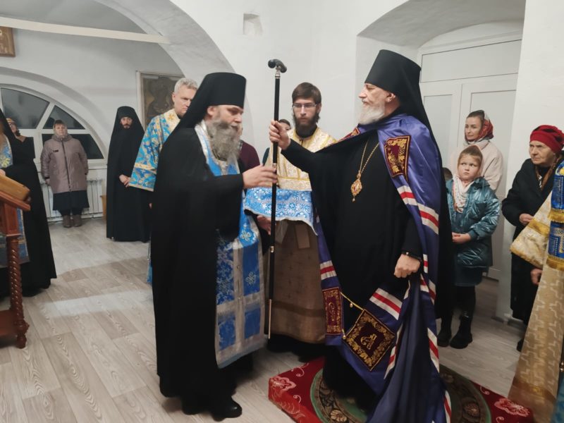 В канун празднования Казанской иконы Божией Матери в надвратном Никольском храме Александро-Ошевенского монастыря всенощное бдение с литией совершил правящий архиерей Плесецкой епархии епископ Александр (Зайцев). Владыка привез в обитель радостную весть: на заседании Священного Синода под председательством Святейшего Патриарха Кирилла монастырь, несколько лет числившийся архиерейским подворьем, получил официальный статус епархиального монастыря. На должность настоятеля монастыря назначен игумен Феодосий (Курицын). По окончании всенощного бдения правящий архиерей зачитал соответствущий указ и вручил отцу Феодосию игуменский жезл. Епископ Александр поздравил новопоставленного настоятеля монастыря с вступлением в должность, пожелал ему помощи Божией и напомнил о той ответственности, которую принимает на себя игумен. Игумен Феодосий поблагодарил владыку и заверил всех присутствующих, что он и братия будут стараться с достоинством нести звание русского монаха. После владыки батюшку горячо поздравили прихожане обители. Радость общения продолжилась за братской трапезой.