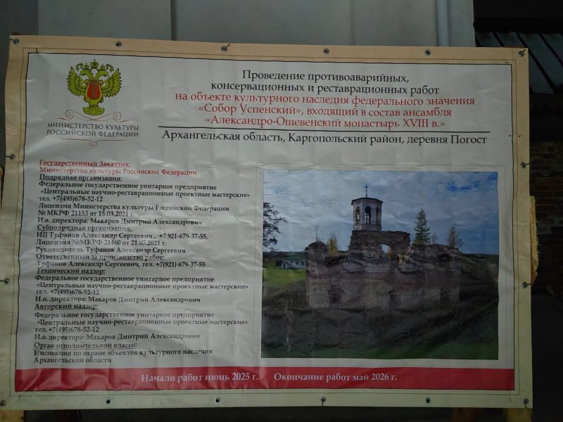 Консервация Успенского собора.26.12.2025 Поделиться:В Каргопольском районе начались работы по консервации Успенского собора Александро- Ошевенского монастыря. Фото: игумена Феодосия (Курицына).